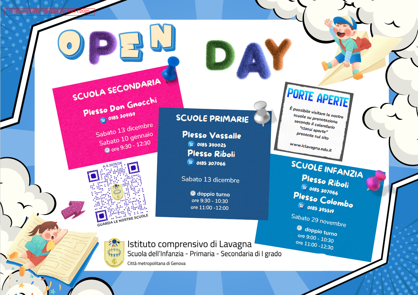 Descrizione In ciascun plesso, nelle date indicate in locandina, si svolgerà l’Open Day. Per maggiori informazioni si rimanda al sito dell'istituto comprensivo: www.iclavagna.edu.it