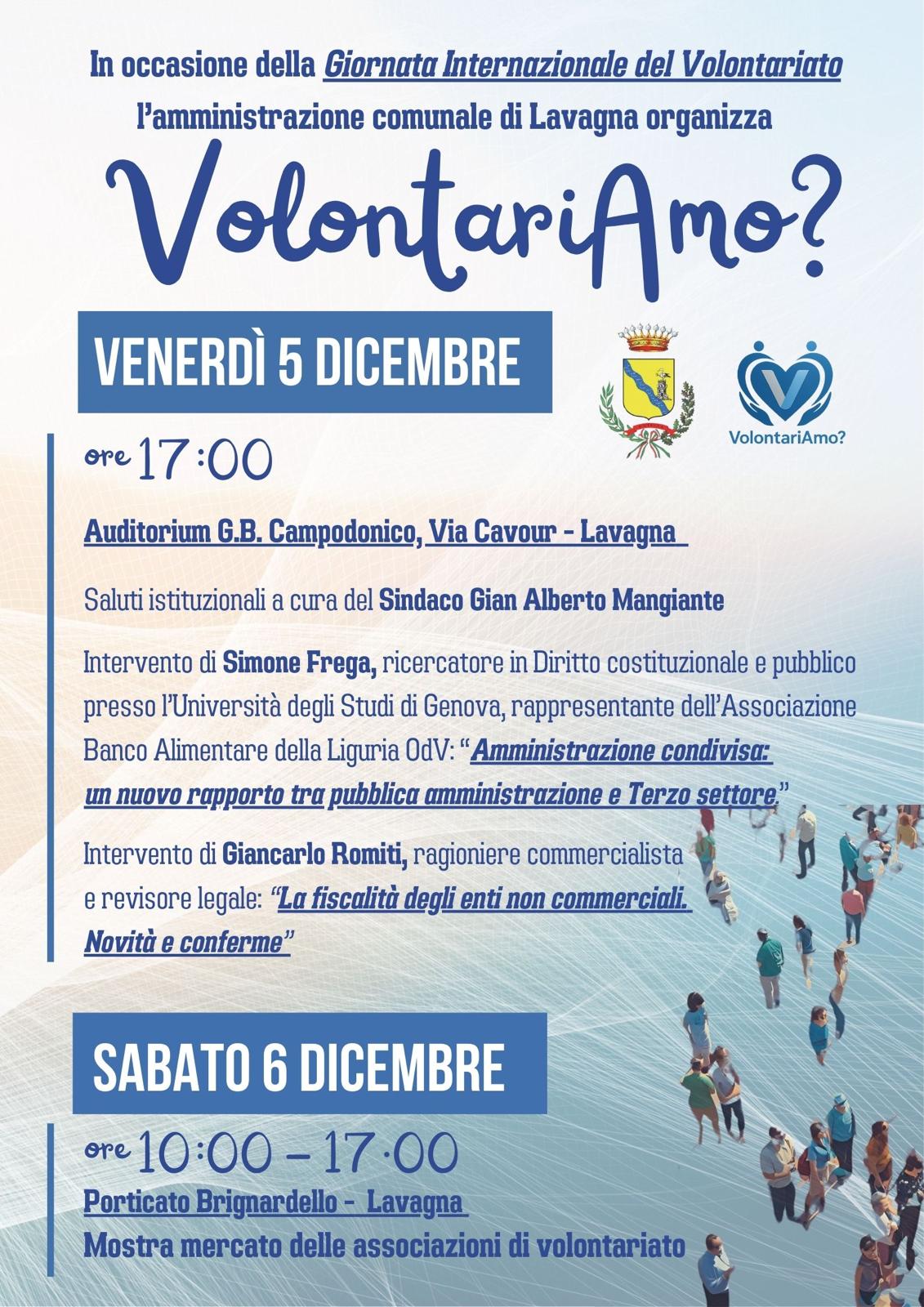 l’Amministrazione Comunale di Lavagna è lieta di estendere il proprio invito a partecipare all’Iniziativa “VolontariAmo?”, organizzata in occasione della Giornata Internazionale del Volontariato.