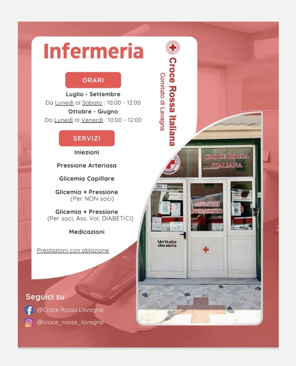 E' attivo lo sportello infermeria presso la sede della Croce Rossa Italiana - Comitato di Lavagna. Lo sportello svolge i seguenti servizi: